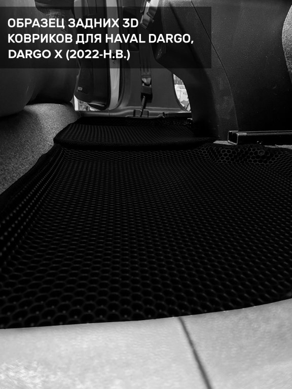 Автомобильные 3д коврики для Haval Dargo (2022-н.в.) в салон авто и багажник сделаны из инновационного полимерного материала EVA, изысканная структура в виде ячеек не дает воде, пыли и снегу разлетаться по салону машины и багажнику. 3д коврики зафиксированы на полу определенными клипсами, соответствующими Haval Dargo (2022-н.в.), и не двигаются в процессе езды.