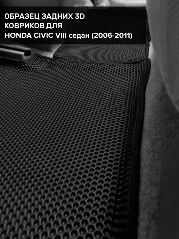 Автомобильные 3д коврики для Honda Civic VIII седан (2005-2012) в салон авто и багажник сделаны из инновационного полимерного материала EVA, изысканная структура в виде ячеек не дает воде, пыли и снегу разлетаться по салону машины и багажнику. 3д коврики зафиксированы на полу определенными клипсами, соответствующими Honda Civic VIII седан (2005-2012), и не двигаются в процессе езды.