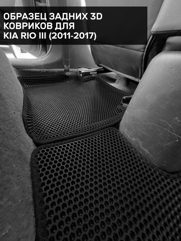 Автомобильные 3д коврики для Kia Rio III седан, хэтчбек, универсал (2011-2017) в салон авто и багажник сделаны из инновационного полимерного материала EVA, изысканная структура в виде ячеек не дает воде, пыли и снегу разлетаться по салону машины и багажнику. 3д коврики зафиксированы на полу определенными клипсами, соответствующими Kia Rio III седан, хэтчбек, универсал (2011-2017), и не двигаются в процессе езды.