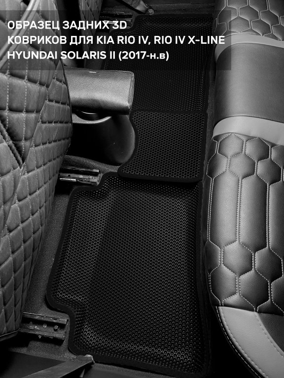 Автомобильные 3д коврики для Kia Rio IV (2017-н.в.) в салон авто и багажник сделаны из инновационного полимерного материала EVA, изысканная структура в виде ячеек не дает воде, пыли и снегу разлетаться по салону машины и багажнику. 3д коврики зафиксированы на полу определенными клипсами, соответствующими Kia Rio IV (2017-н.в.), и не двигаются в процессе езды.