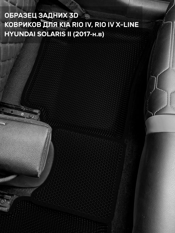 Автомобильные 3д коврики для Kia Rio IV X-Line (2017-н.в.) в салон авто и багажник сделаны из инновационного полимерного материала EVA, изысканная структура в виде ячеек не дает воде, пыли и снегу разлетаться по салону машины и багажнику. 3д коврики зафиксированы на полу определенными клипсами, соответствующими Kia Rio IV X-Line (2017-н.в.), и не двигаются в процессе езды.