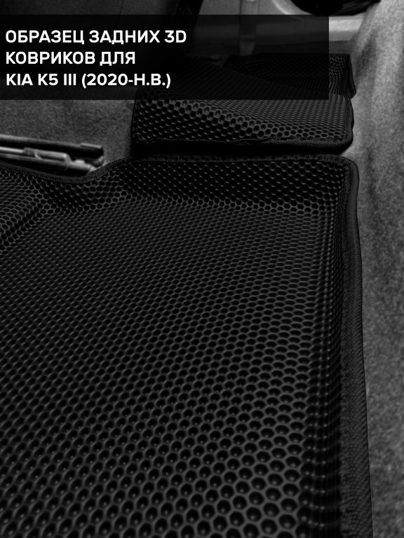Автомобильные 3д коврики для Kia K5 III (2019-н.в.) в салон авто и багажник сделаны из инновационного полимерного материала EVA, изысканная структура в виде ячеек не дает воде, пыли и снегу разлетаться по салону машины и багажнику. 3д коврики зафиксированы на полу определенными клипсами, соответствующими Kia K5 III (2019-н.в.), и не двигаются в процессе езды.