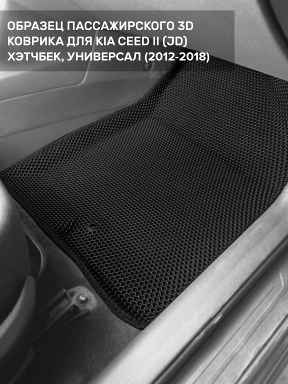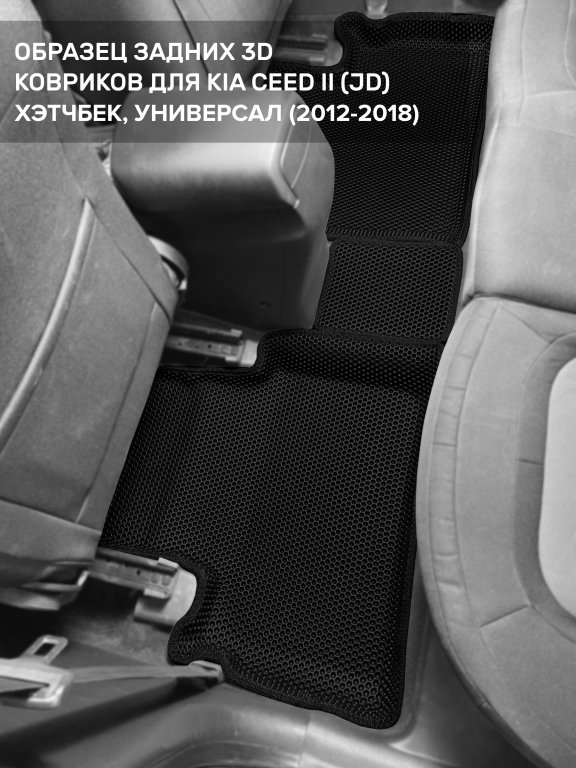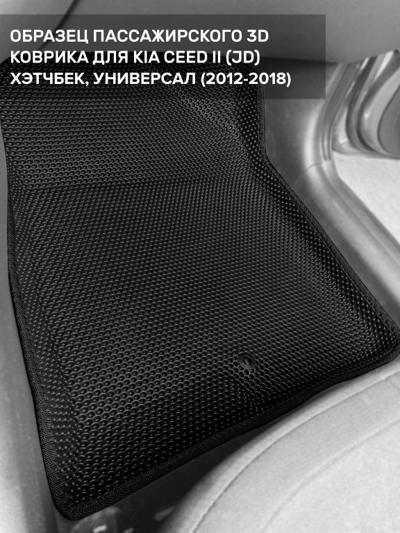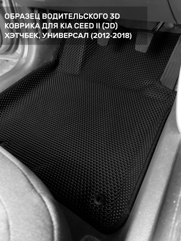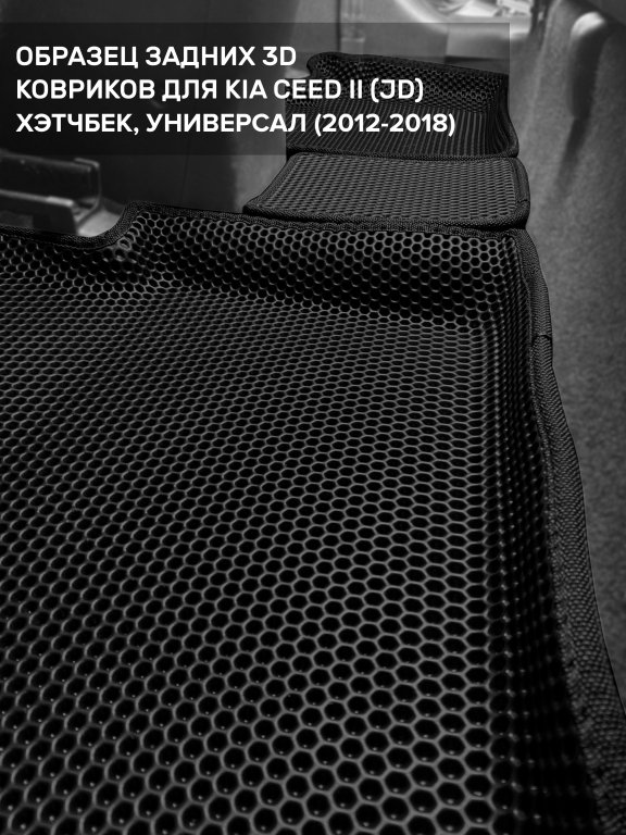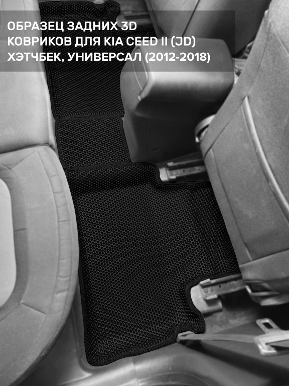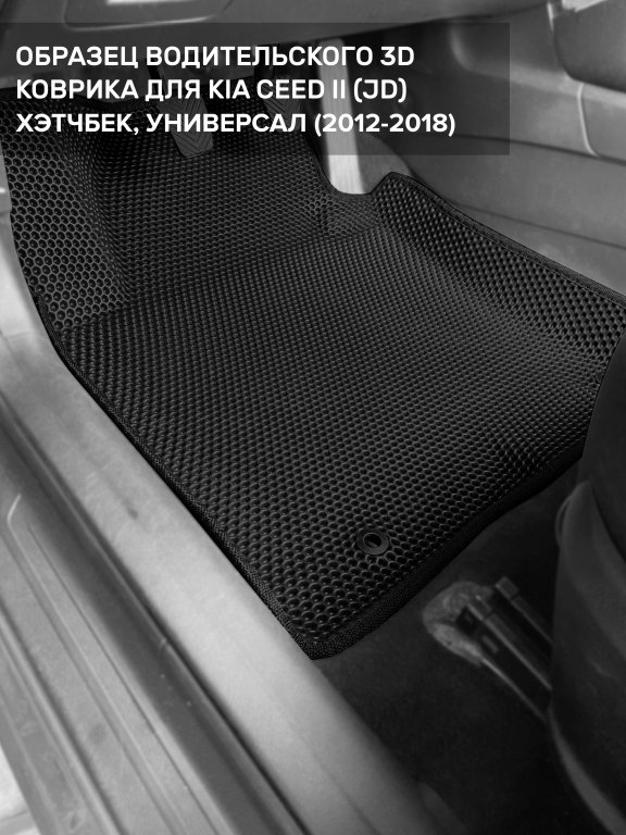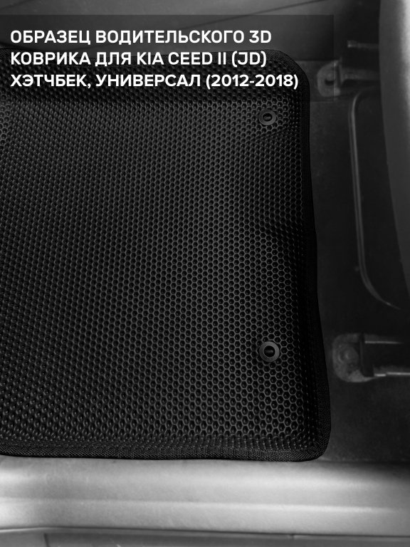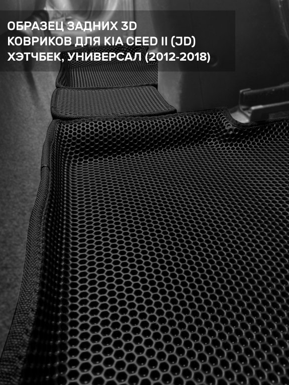 Автомобильные 3д коврики для Kia Ceed II (JD) хэтчбек, универсал (2012-2018) в салон авто и багажник сделаны из инновационного полимерного материала EVA, изысканная структура в виде ячеек не дает воде, пыли и снегу разлетаться по салону машины и багажнику. 3д коврики зафиксированы на полу определенными клипсами, соответствующими Kia Ceed II (JD) хэтчбек, универсал (2012-2018), и не двигаются в процессе езды.