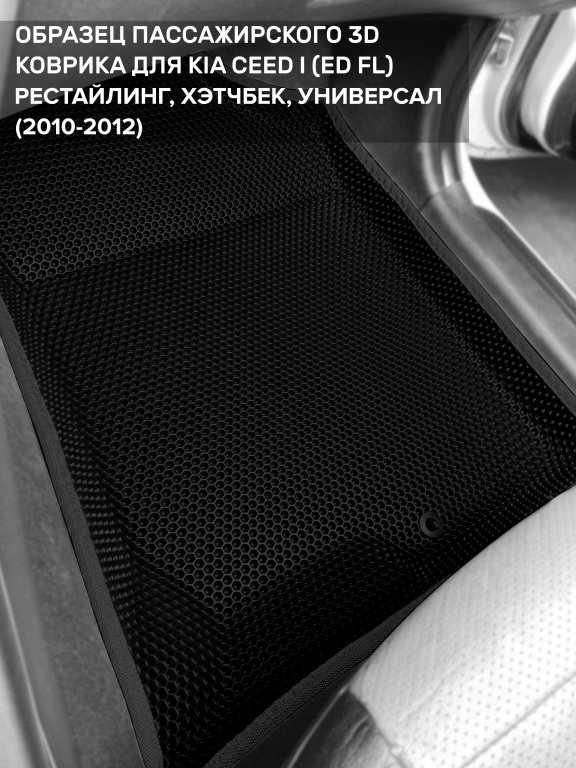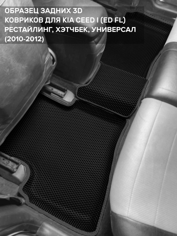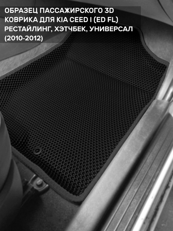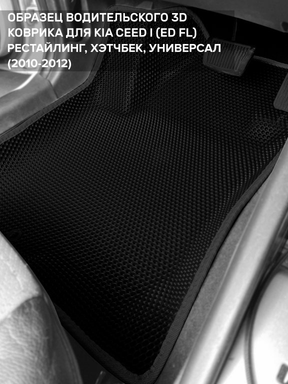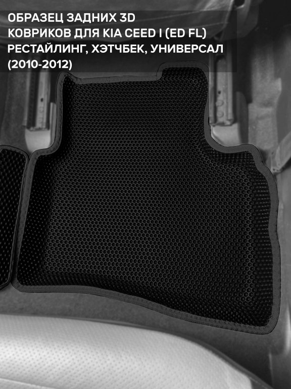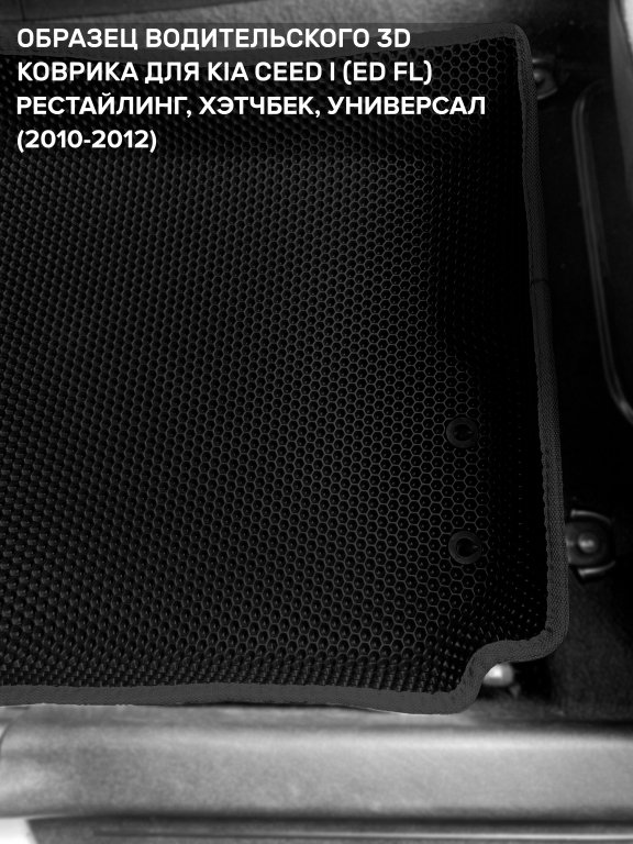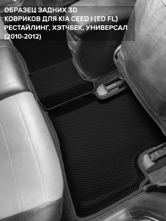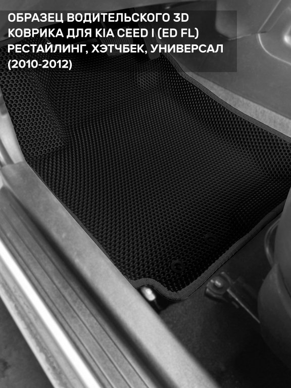 Автомобильные 3д коврики для Kia Ceed I рестайлинг (ED FL) (2010-2012) в салон авто и багажник сделаны из инновационного полимерного материала EVA, изысканная структура в виде ячеек не дает воде, пыли и снегу разлетаться по салону машины и багажнику. 3д коврики зафиксированы на полу определенными клипсами, соответствующими Kia Ceed I рестайлинг (ED FL) (2010-2012), и не двигаются в процессе езды.