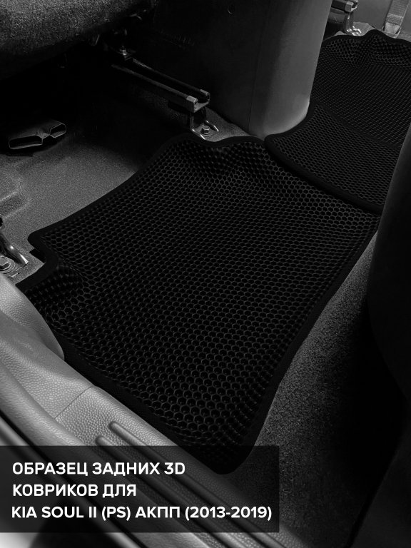 Автомобильные 3д коврики для Kia Soul II (PS) (2013-2019) в салон авто и багажник сделаны из инновационного полимерного материала EVA, изысканная структура в виде ячеек не дает воде, пыли и снегу разлетаться по салону машины и багажнику. 3д коврики зафиксированы на полу определенными клипсами, соответствующими Kia Soul II (PS) (2013-2019), и не двигаются в процессе езды.