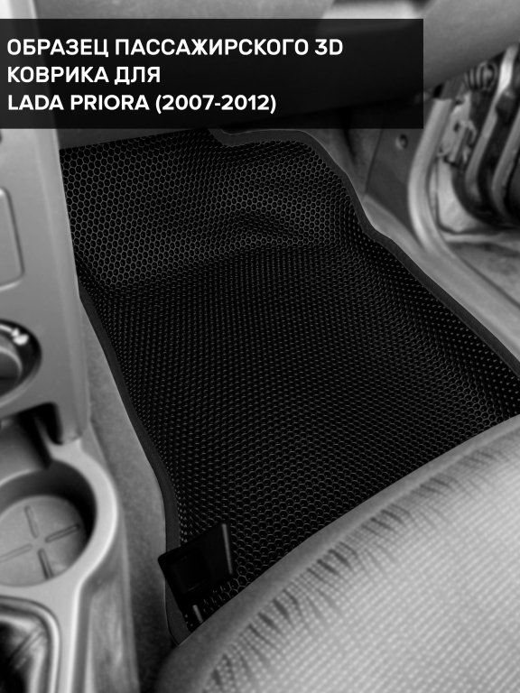 Автомобильные 3д коврики для Lada Priora (2007-2013) в салон авто и багажник сделаны из инновационного полимерного материала EVA, изысканная структура в виде ячеек не дает воде, пыли и снегу разлетаться по салону машины и багажнику. 3д коврики зафиксированы на полу определенными клипсами, соответствующими Lada Priora (2007-2013), и не двигаются в процессе езды.