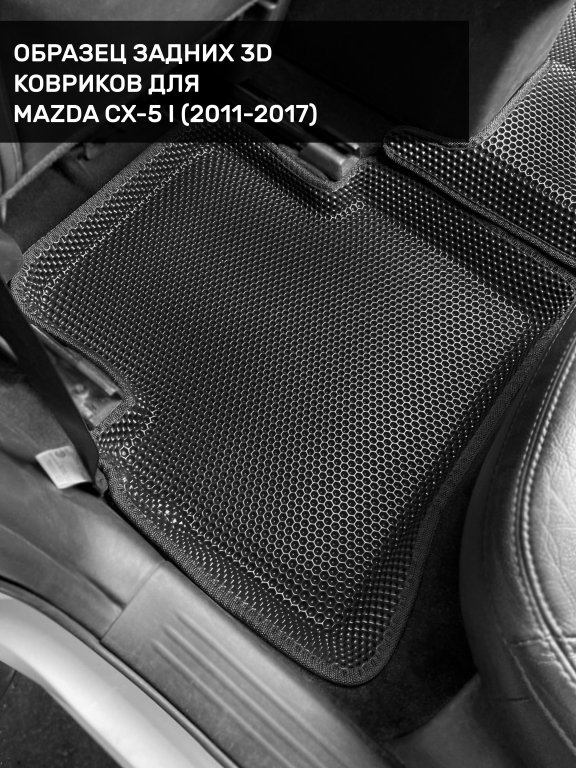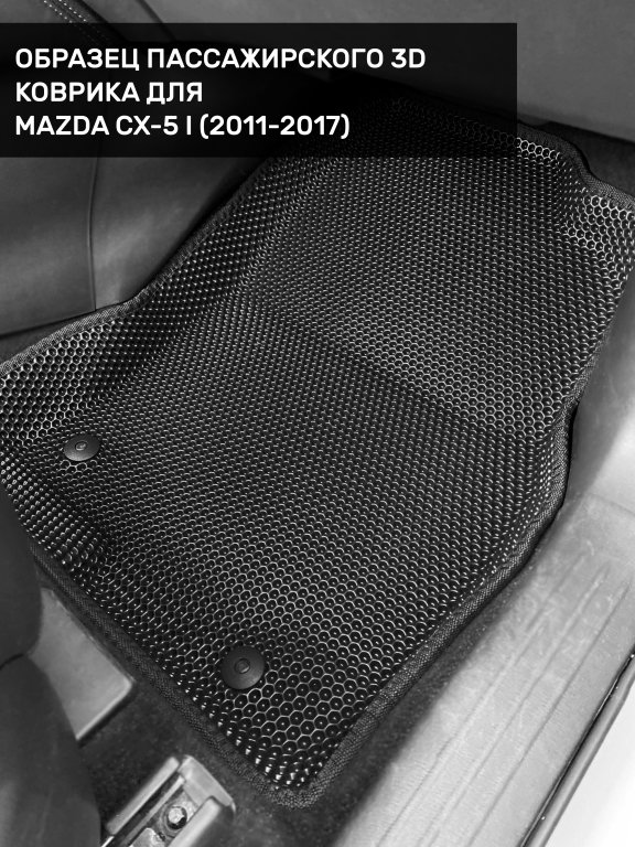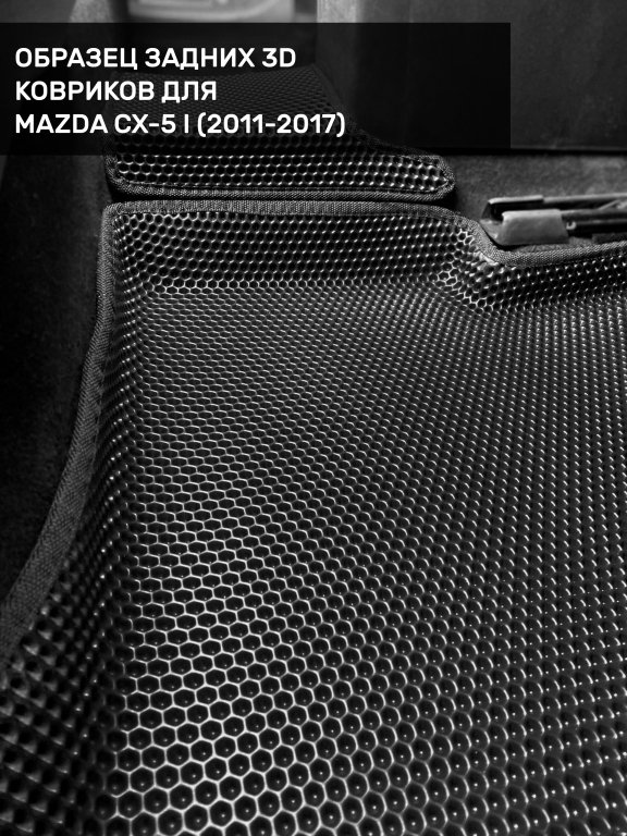 Автомобильные 3д коврики для Mazda CX-5 I (2011-2017) в салон авто и багажник сделаны из инновационного полимерного материала EVA, изысканная структура в виде ячеек не дает воде, пыли и снегу разлетаться по салону машины и багажнику. 3д коврики зафиксированы на полу определенными клипсами, соответствующими Mazda CX-5 I (2011-2017), и не двигаются в процессе езды.