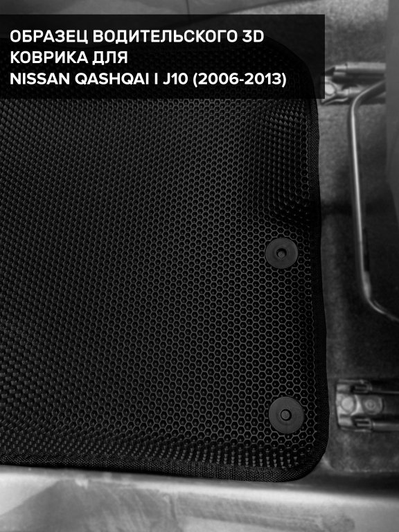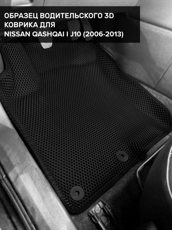 Автомобильные 3д коврики для Nissan Qashqai I J10 (2006-2013) в салон авто и багажник сделаны из инновационного полимерного материала EVA, изысканная структура в виде ячеек не дает воде, пыли и снегу разлетаться по салону машины и багажнику. 3д коврики зафиксированы на полу определенными клипсами, соответствующими Nissan Qashqai I J10 (2006-2013), и не двигаются в процессе езды.