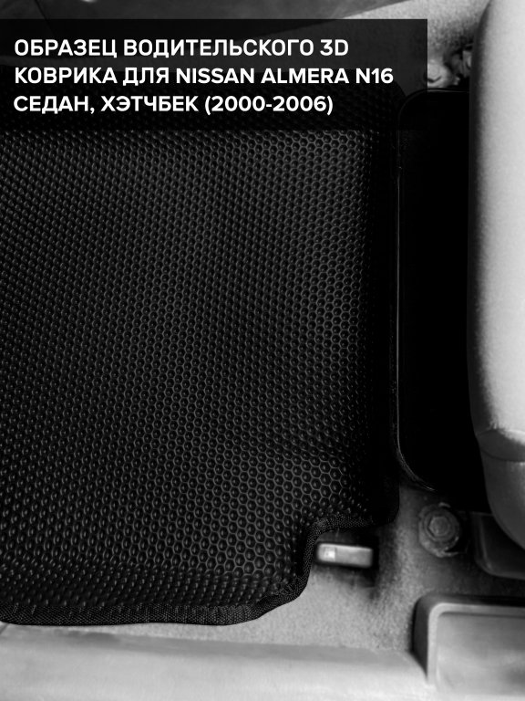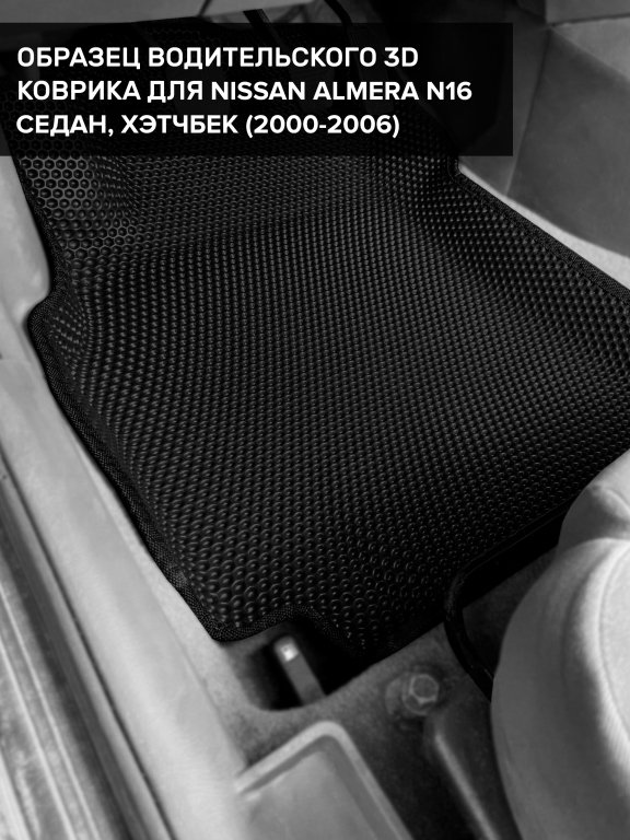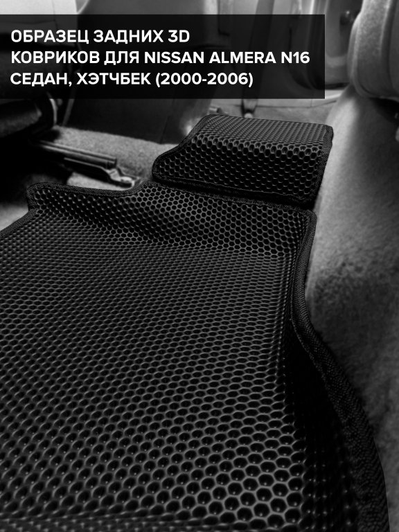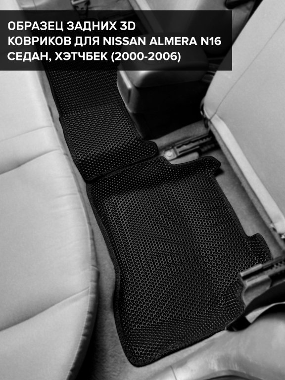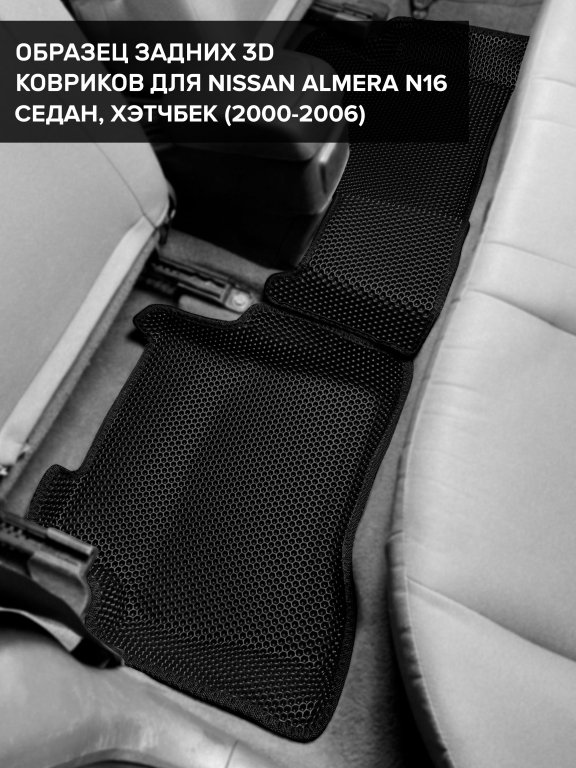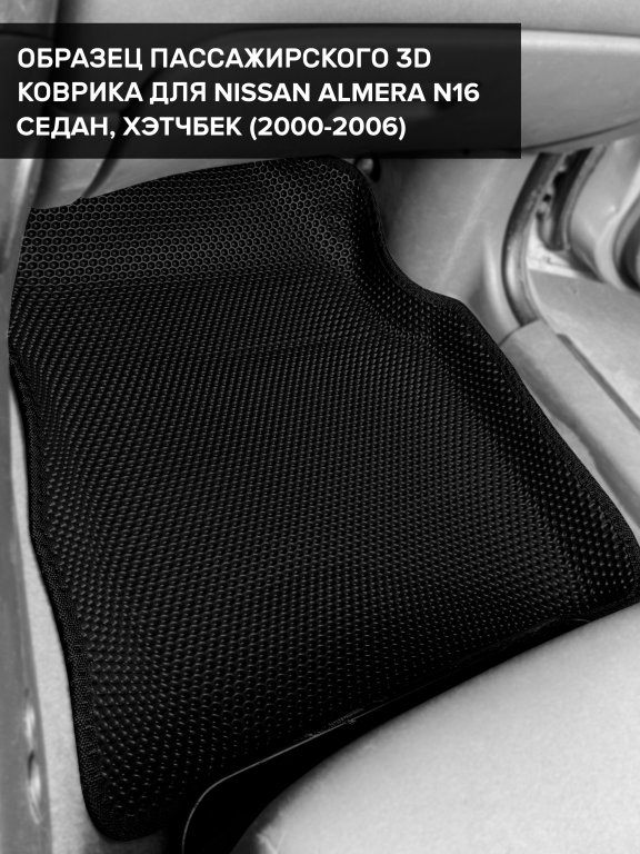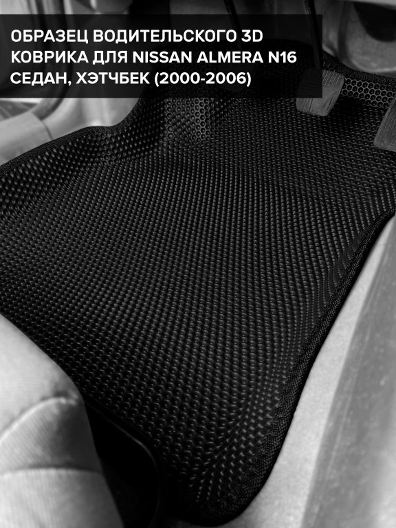 Автомобильные 3д коврики для Nissan Almera N16 седан, хэтчбек (2000-2006) в салон авто и багажник сделаны из инновационного полимерного материала EVA, изысканная структура в виде ячеек не дает воде, пыли и снегу разлетаться по салону машины и багажнику. 3д коврики зафиксированы на полу определенными клипсами, соответствующими Nissan Almera N16 седан, хэтчбек (2000-2006), и не двигаются в процессе езды.