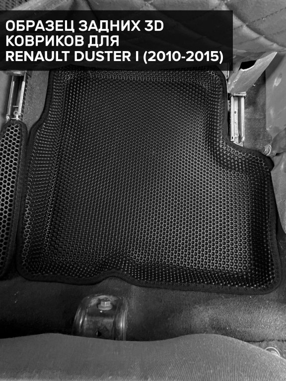 Автомобильные 3д коврики для Renault Duster I (2010-2015) в салон авто и багажник сделаны из инновационного полимерного материала EVA, изысканная структура в виде ячеек не дает воде, пыли и снегу разлетаться по салону машины и багажнику. 3д коврики зафиксированы на полу определенными клипсами, соответствующими Renault Duster I (2010-2015), и не двигаются в процессе езды.