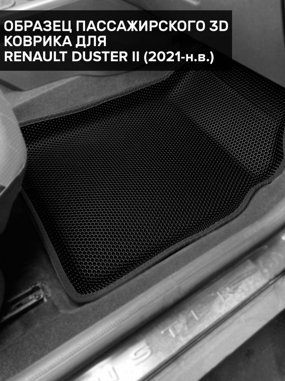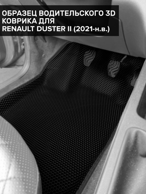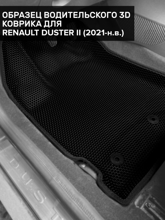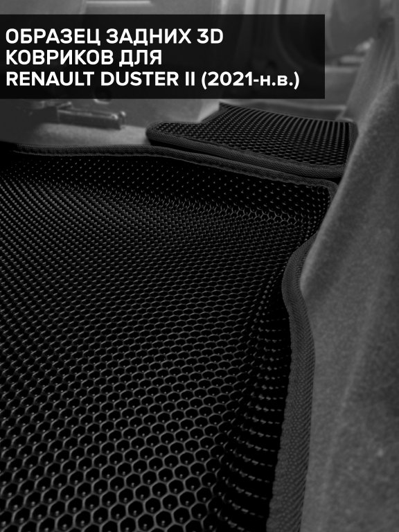 Автомобильные 3д коврики для Renault Duster II (2020-н.в.) в салон авто и багажник сделаны из инновационного полимерного материала EVA, изысканная структура в виде ячеек не дает воде, пыли и снегу разлетаться по салону машины и багажнику. 3д коврики зафиксированы на полу определенными клипсами, соответствующими Renault Duster II (2020-н.в.), и не двигаются в процессе езды.
