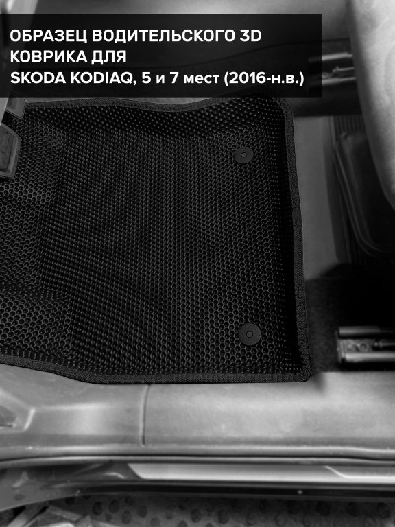 Автомобильные 3д коврики для Skoda Kodiaq I, 5 мест (2016-2025) в салон авто и багажник сделаны из инновационного полимерного материала EVA, изысканная структура в виде ячеек не дает воде, пыли и снегу разлетаться по салону машины и багажнику. 3д коврики зафиксированы на полу определенными клипсами, соответствующими Skoda Kodiaq I, 5 мест (2016-2025) , и не двигаются в процессе езды.