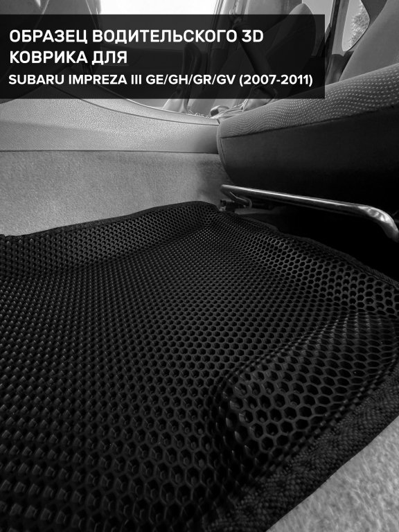 Автомобильные 3д коврики для Subaru Impreza III GE/GH/GR/GV (2007-2011) в салон авто и багажник сделаны из инновационного полимерного материала EVA, изысканная структура в виде ячеек не дает воде, пыли и снегу разлетаться по салону машины и багажнику. 3д коврики зафиксированы на полу определенными клипсами, соответствующими Subaru Impreza III GE/GH/GR/GV (2007-2011) , и не двигаются в процессе езды.