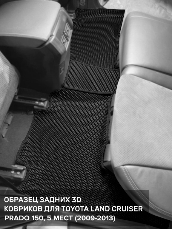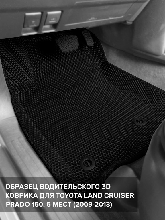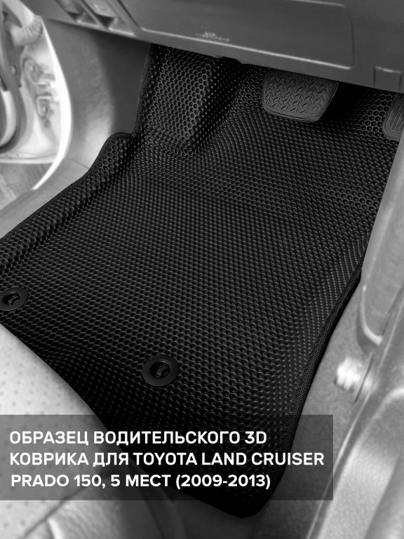 Автомобильные 3д коврики для Toyota Land Cruiser Prado 150 (2009-н.в.) в салон авто и багажник сделаны из инновационного полимерного материала EVA, изысканная структура в виде ячеек не дает воде, пыли и снегу разлетаться по салону машины и багажнику. 3д коврики зафиксированы на полу определенными клипсами, соответствующими Toyota Land Cruiser Prado 150 (2009-н.в.), и не двигаются в процессе езды.